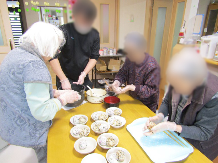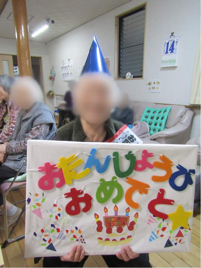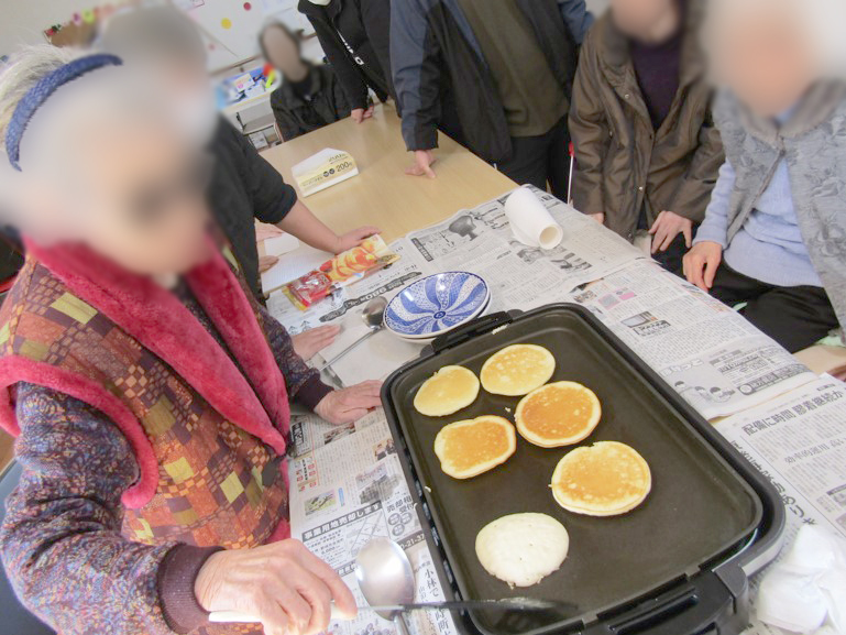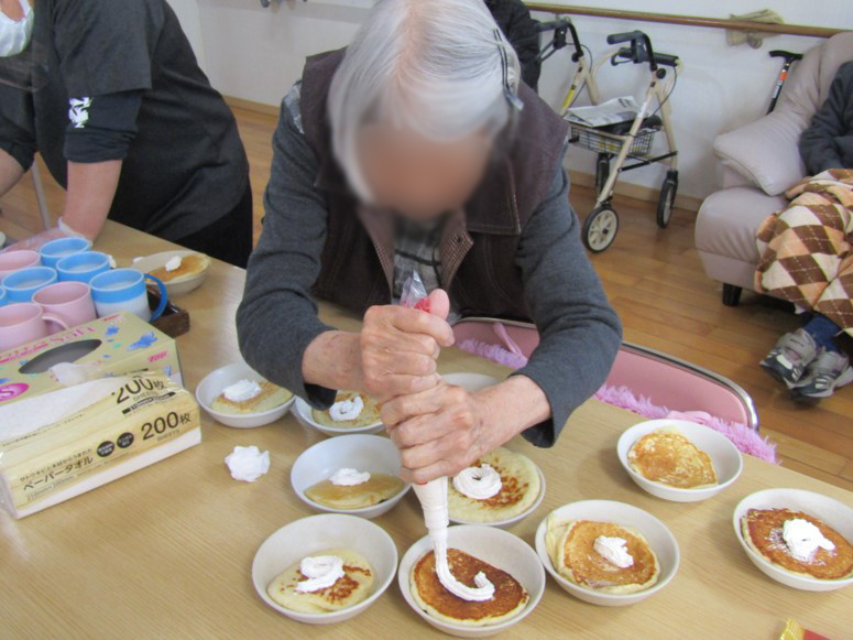 誕生日会では利用者様もいい笑顔を見せて下さり、調理レクリエーションでは、おにぎり作りや、ホットケーキ作りをして皆様美味しいと喜んで食べていました。中には大きいホットケーキを最初から選んでいる方もいました。