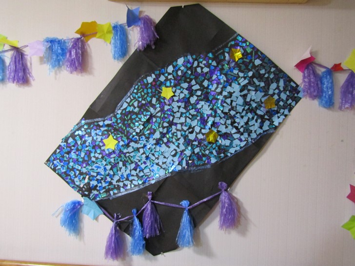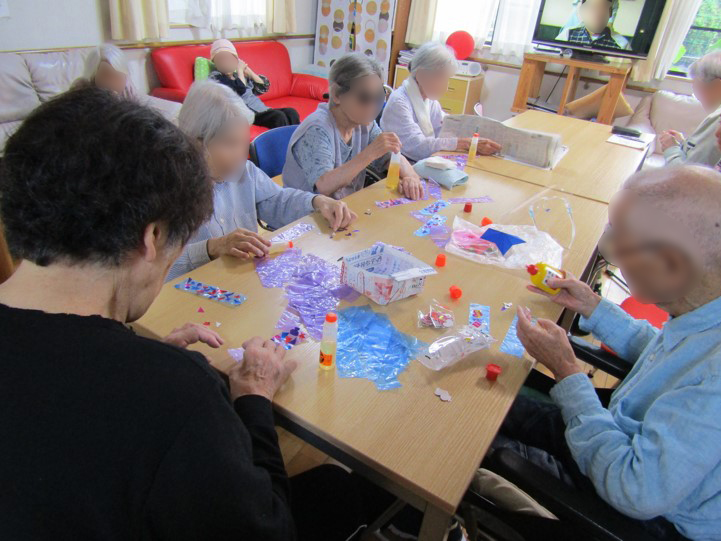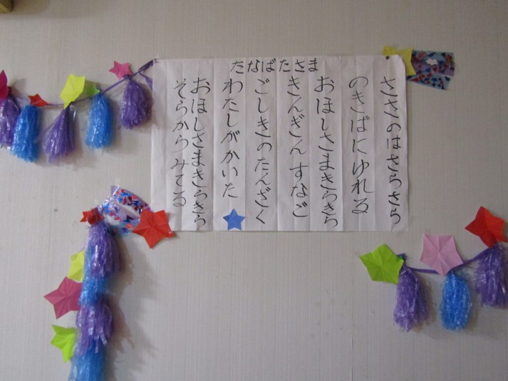 こんにちは、グループホーム和楽です。 今月は七夕がありましたね。和楽でも利用者様達が七夕飾りのお手伝いをして下さりました。 大き目の模造用紙に天の川のちぎり絵もして頂き、とても素敵なものが出来上がりました。 歌詞の画像の文字は、利用者様が手書きで書いてくださったものです! どんなお願い事がありますか?と聞くと「美味しいものを腹いっぱい食べたいね」や「秘密よ」など様々でした。