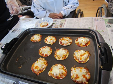 続いて10月は「ピザが食べてみたい」と言う利用者様の声から、何とか皆で作れないか考え、餃子の皮でツナと、コーン、チーズを乗せミニピザの様なものを作りました🍕